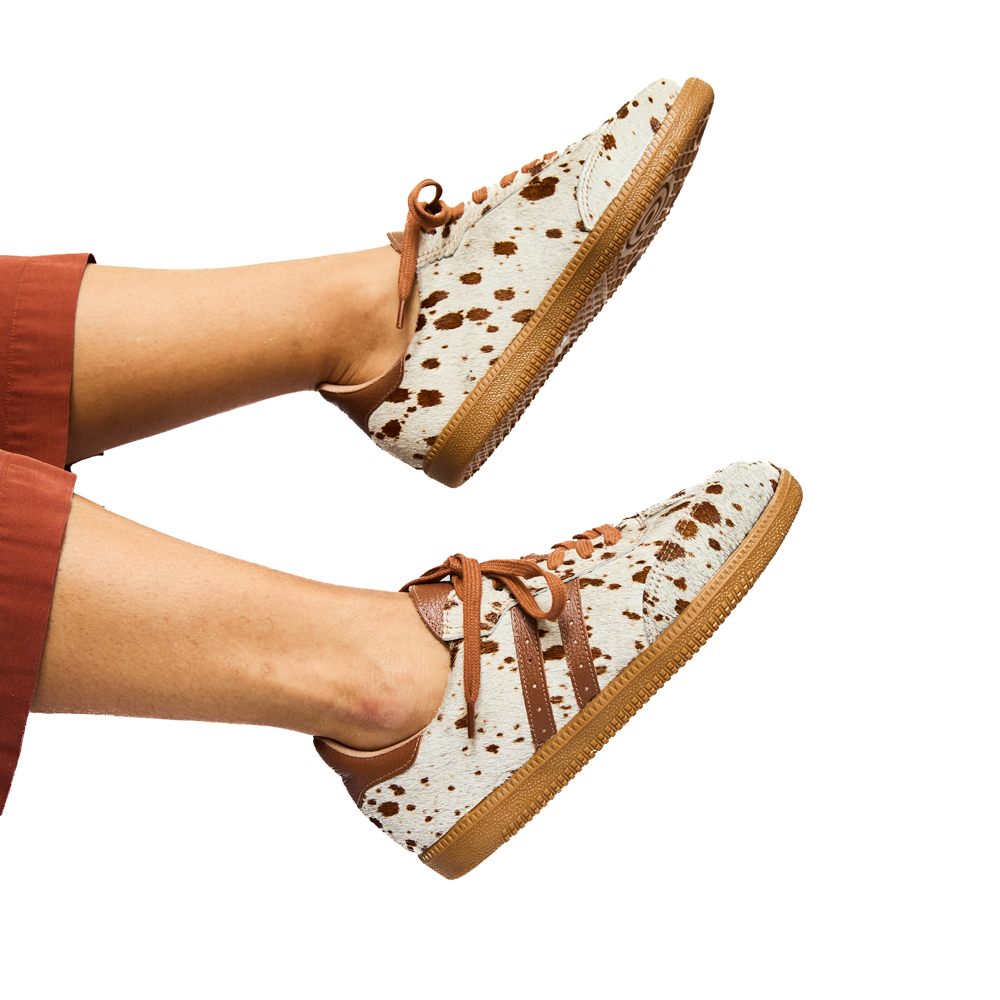 O tênis Ema é o modelo ideal para quem busca conforto, estilo e autenticidade. Cabedal confeccionado em couro legítimo, com estampa em cow print e fechamento em cadarço para proporcionar o ajuste perfeito aos pés.